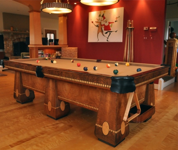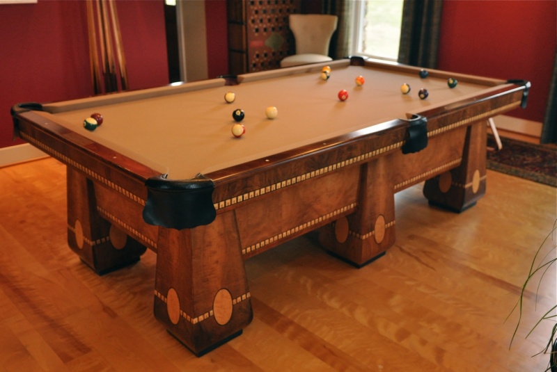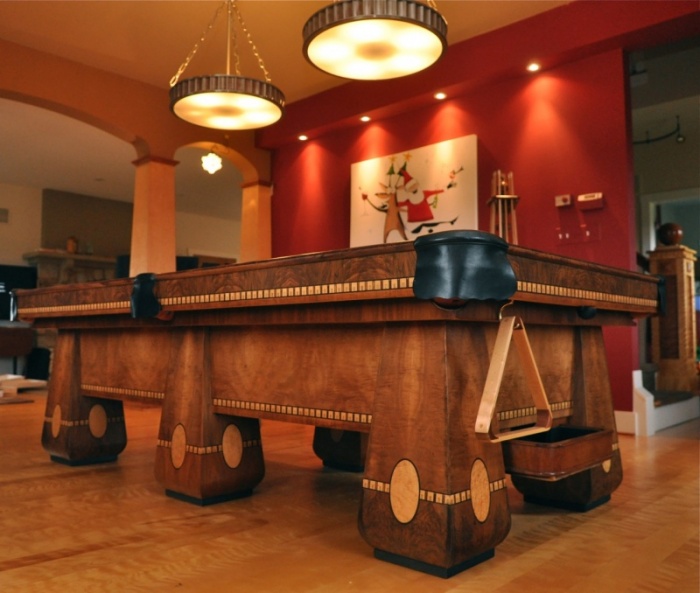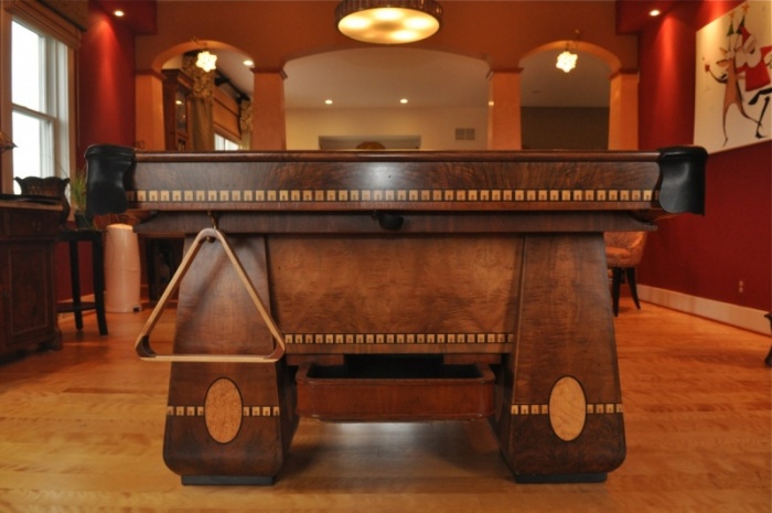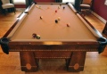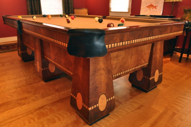 Very rare 6 leg model in 4' by 8' size. Beautifully restored from a solid original, including the many figured veneers. All finished in a satin hand rubbed lacquer. Original Brunswick slates, pocket irons. Ball return tubes. Has all of the blind covers. Round mother of pearl sights in new figured and bookmatched rosewood species top rails. Plays great. You will not find another of this quality. I can assist with shipping and setup at your location. Call or email for any details.