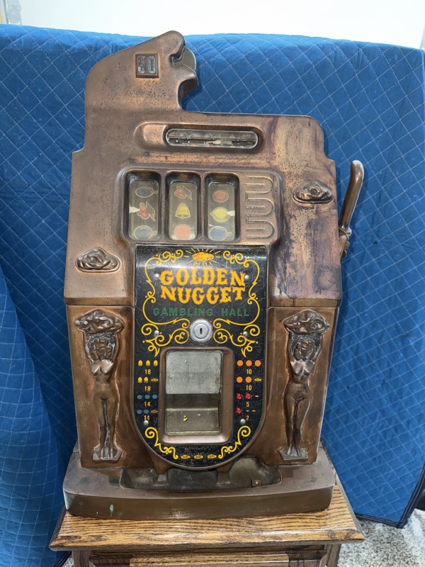 If you want maximum presence, maximum denomination, and maximum attitude, this is it. The 50-cent Golden Nugget was built for serious play and serious players, and today it stands as one of the most impressive vintage slots you can own. A 50-cent slot in its day was a high-roller machine. This would have lived in a prime casino or gambling hall location, pulling in players who wanted bigger action and bigger payouts. That history is exactly what gives this machine its commanding presence today.