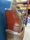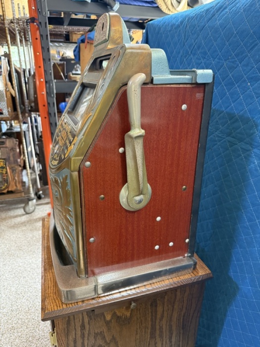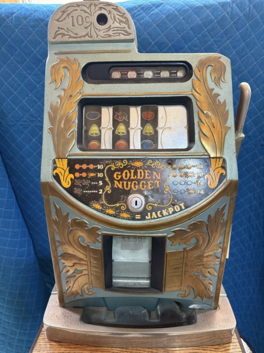 This machine hits you the second you see it. The Golden Nugget name wasn’t chosen lightly—this is a bold, flashy, unapologetically classic American slot from the golden era of coin-op gambling. This Golden Nugget hails from a time when slot machines were designed to lure players from across the room with color, shine, and movement. It represents the transition from purely mechanical antiques into the flashier, more stylized casino machines that followed—making it a bridge between eras and a fantastic talking piece.
