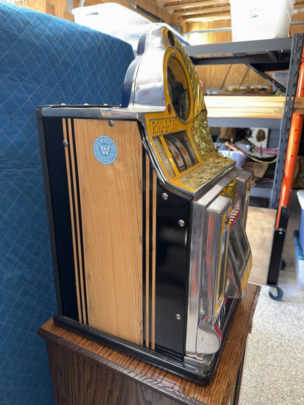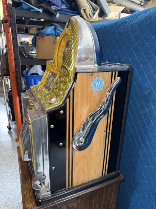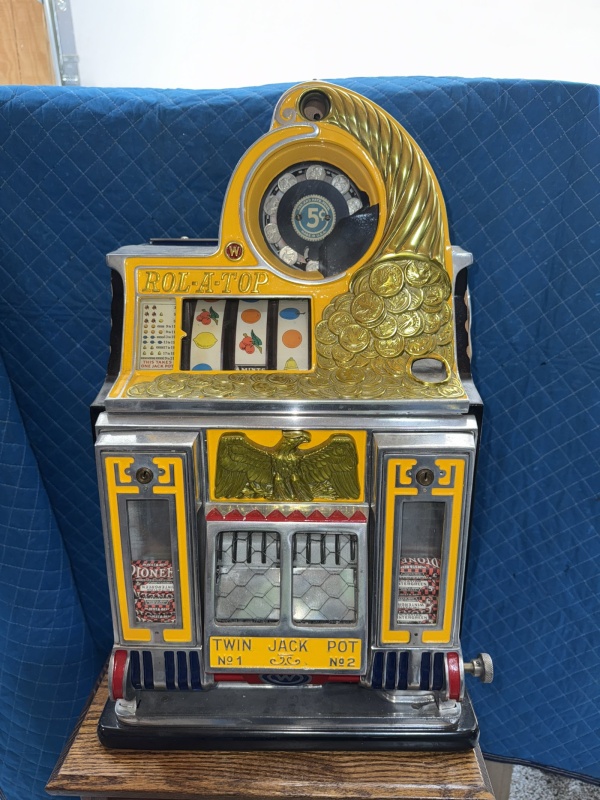 The Watling "Coin Front" Vendor (sometimes referred to by its eagle motif variants like the "Treasury" or "Eagle Front") is a quintessential early 1930s machine—a rugged predecessor to the famous "Rol-A-Top" line. The 5-Cent denomination was the standard, ensuring this machine was the workhorse of the early slot machine era!
